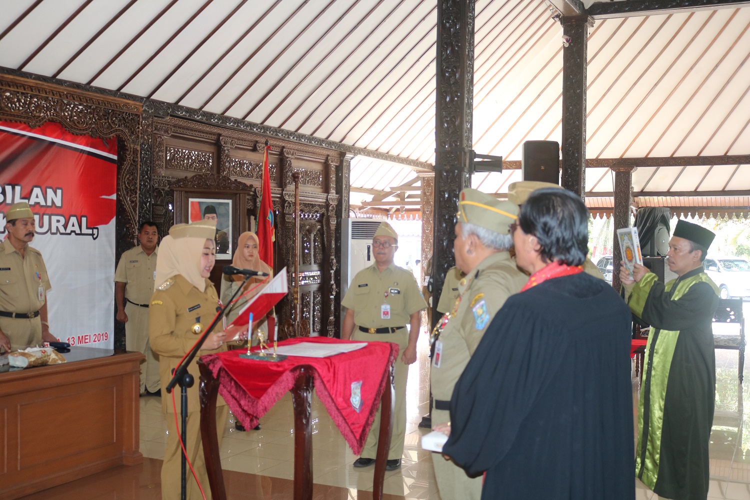 PURBALINGGA, INFO- 11 Pejabat tinggi pratama (Eselon II) di lingkungan Pemerintah Kabupaten (Pemkab) Purbalingga dilantik hari ini, Senin (13/5) di Pendapa Dipokusumo Purbalingga. Pengambilan sumpah jabatan dilakukan oleh Bupati Purbalingga Dyah Hayuning Pratiwi (Tiwi) yang disaksikan oleh Kepala DKPP Sediyono dan Kepala Dinporapar Yanuar Abidin.