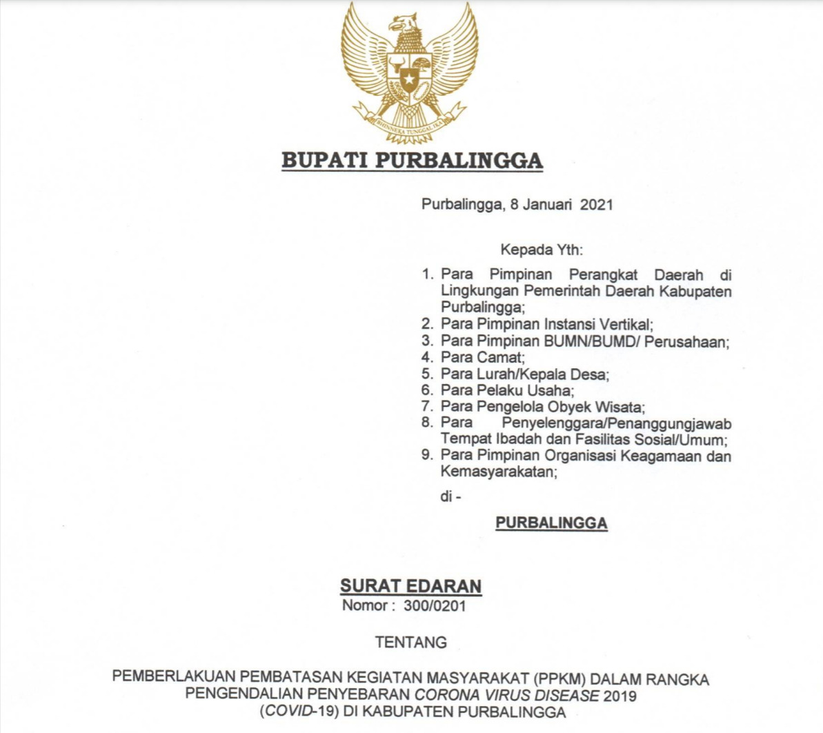 SURAT EDARAN BUPATI TENTANG PEMBERLAKUAN PEMBATASAN KEGIATAN MASYARAKAT (PPKM) DALAM RANGKA PENGENDALIAN PENYEBARAN CORONA VIRUS DISEASE 2019 (COVID-19) DI KABUPATEN PURBALINGGA