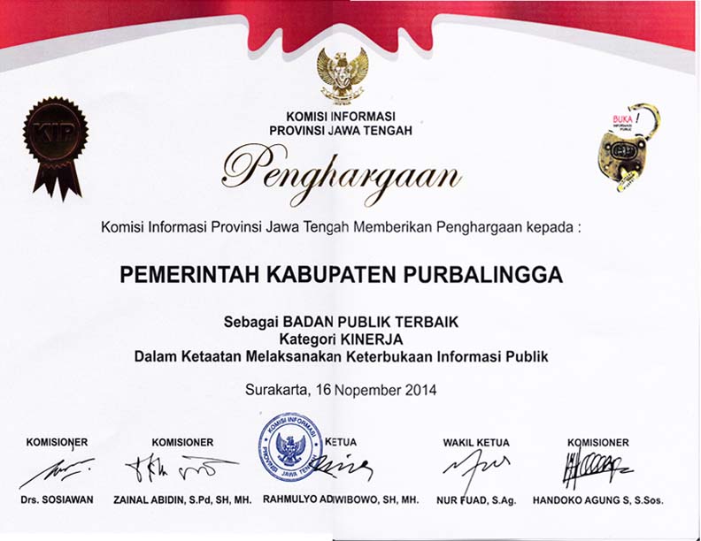 Setelah sebelumnya menempati ranking terendah, kini Kabupaten Purbalingga menempati ranking terbaik kedua se-Jawa Tengah setelah Kota Semarang dalam hal Keterbukaan Informasi Publik (KIP). Tiga kategori yang dinilai oleh Komisi Informasi Provinsi Jawa Tengah, kabupaten Purbalingga masuk semua kategori dan mendapatkan piagam penghargaan. Bahkan dua kategori, yakni kategori Kinerja Dalam Ketaatan Melaksanakan Keterbukaan Informasi Public dan…