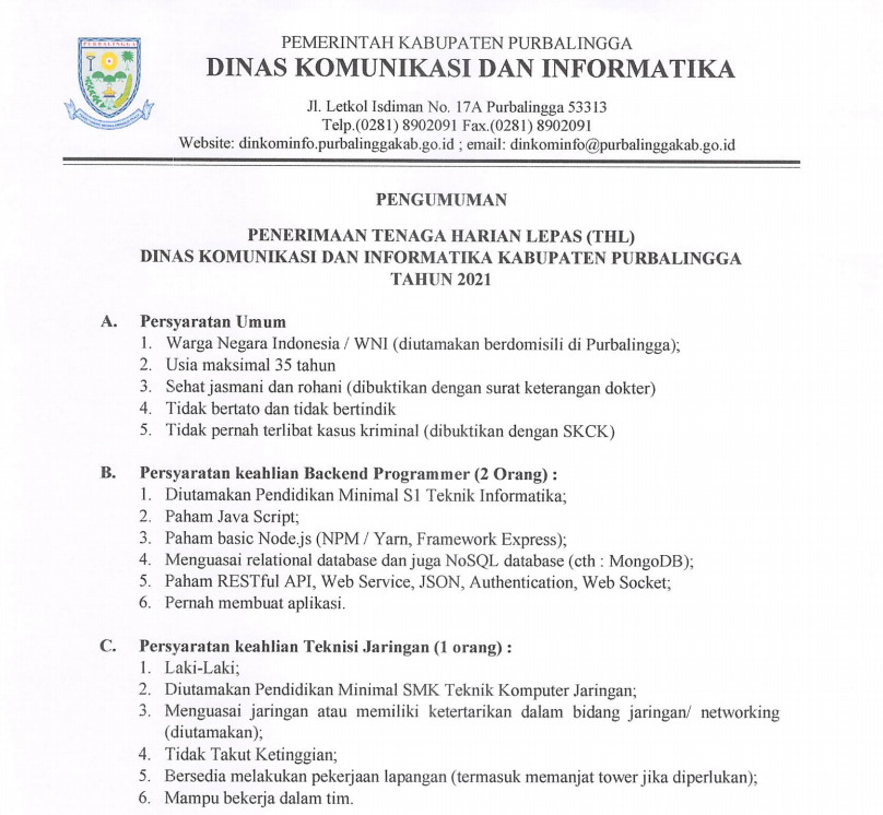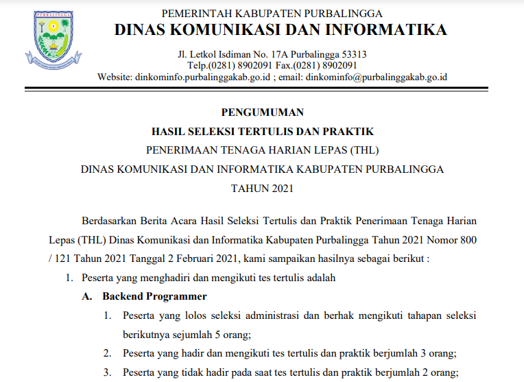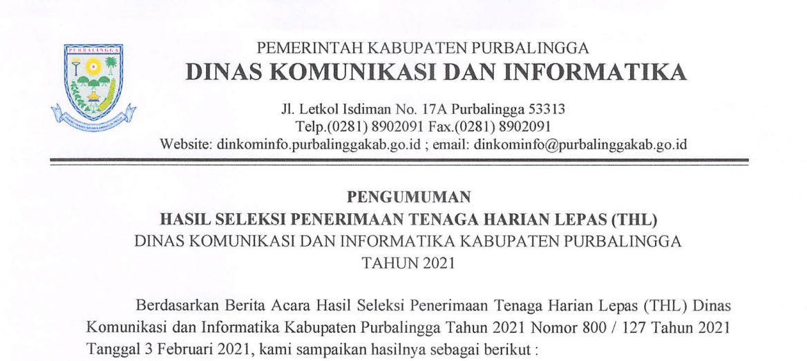 PENGUMUMAN!!! HASIL SELEKSI PENERIMAAN TENAGA HARIAN LEPAS (THL) DINKOMINFO PURBALINGGA TAHUN 2021