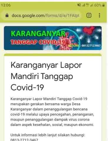 Tofik mengirimkan pesan melalui WA yang bertuliskan “Untuk Warga Desa Karanganyar, mohon partisipasinya untuk mengisi formulir Lapor Mandiri terkait Virus Covid-19 sbb : https://forms.gle/YEr2ELTkrbVditxEA”