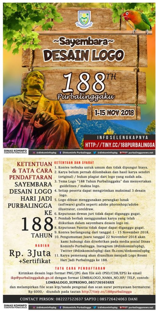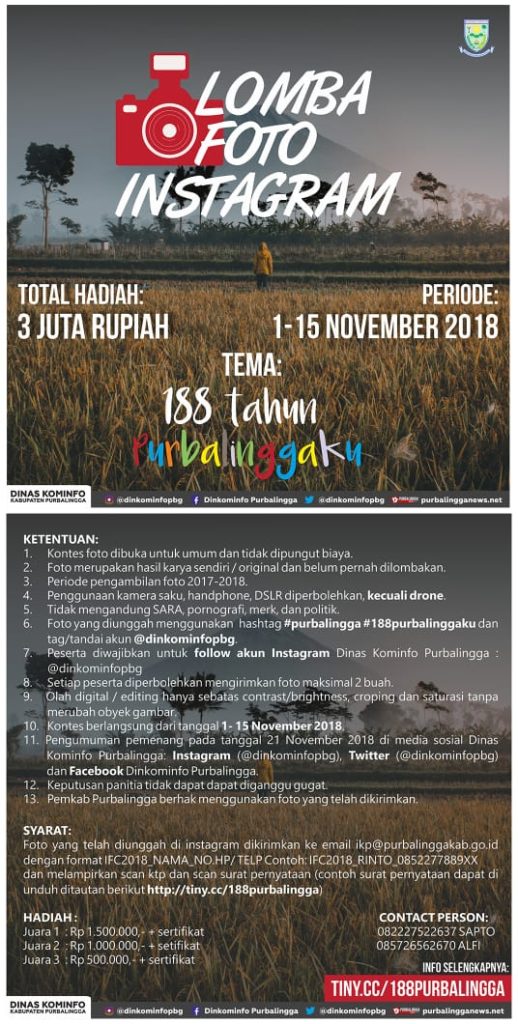 PURBALINGGA INFO, Guna memeriahkan Hari Jadi Purbalingga yang ke 188, Dinas Komunikasi dan Informatika (Dinkominfo) Purbalingga menggelar 3 perlombaan yakni lomba foto instagram, desain logo hari jadi dan penulisan artikel. Ketiga perlombaan bertemakan 188 Tahun Purbalinggaku, tema tersebut bertujuan untuk membangkitkan semangat untuk membangun Purbalingga.