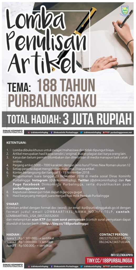 “ Karya lomba merupakan karya orisinil bukan plagiator dari orang lain, dan bersifat terbuka untuk umum, kecuali untuk penulisan artikel hanya untuk pelajar dan mahasiswa. Ketentuan lebih lanjut bisa di buka di purbalingganews.net dengan links http://tiny.cc/188purbalingga,” ujarnya.