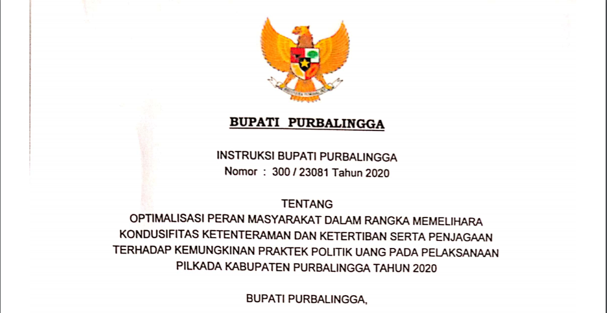 OPTIMALISASI PERAN MASYARAKAT DALAM RANGKA MEMELIHARA KONDUSIFITAS KETENTERAMAN DAN KETERTIBAN SERTA PENJAGAAN TERHADAP KEMUNGKINAN PRAKTEK POLITIK UANG PADA PELAKSANAAN PILKADA KABUPATEN PURBALINGGA TAHUN 2020