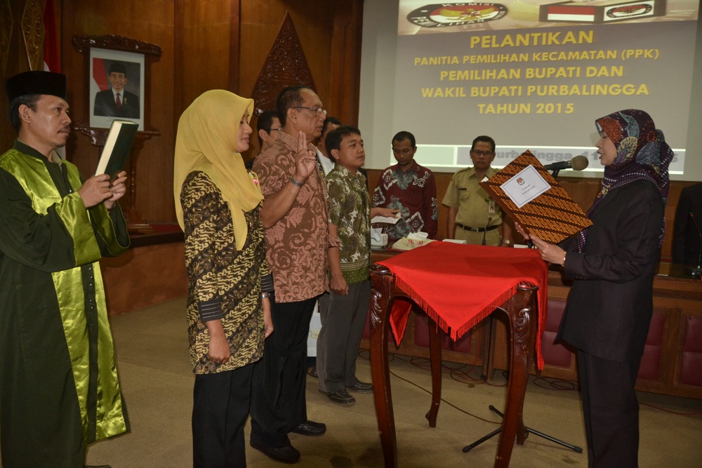 PURBALINGGA  – Setelah melalui tahapan perekrutan Panitia Pemilihan Kecamatan (PPK), Komisi Pemilihan Umum (KPU) Purbalingga, Senin pagi (11/5) melantik 90 PPK untuk pemilihan Bupati dan Wakil Bupati Purbalingga (Pilkada) 2015. Pelantikan dilakukan oleh Ketua KPU Sri Wahyuni di Operation Room Graha Adiguna komplek Pendapa Dipokusumo.